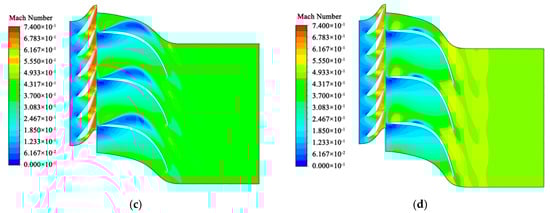 The Mach number comparison: (a) Mach number of preliminary design at a span of 0.7; (b) Mach number of optimization result at a span of 0.7; (c) Mach number of preliminary design at a span of 0.9; (d) Mach number of optimization result at a span of 0.9.