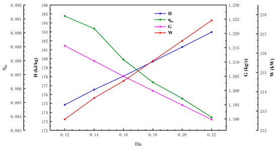 Testing was conducted under off-design conditions to evaluate the turbine’s performance. This section presents some results from the off-design analysis. As the hydrogen content in the fuel increases, the amount of water in the combustion products also rises correspondingly. This variation in water content influences the turbine’s operating performance. This section examines the relationship between different water content levels in hydrogen combustion products and turbine performance using the optimized radial hydrogen turbine. The water mass rates analyzed were 0.12, 0.14, 0.16, 0.18, 0.20, and 0.22. The primary parameters studied included efficiency, mass flow, power, and enthalpy drop.