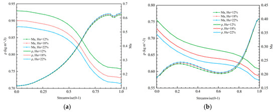 Comparison of density and Mach number in different water content: (a) curves of stationary blades; (b) impeller curves.