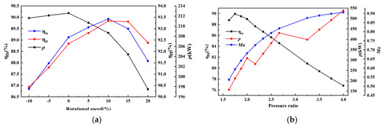 Shows the off-design analysis results: (a) curves of different rotational speeds; (b) curves of different pressure ratios.