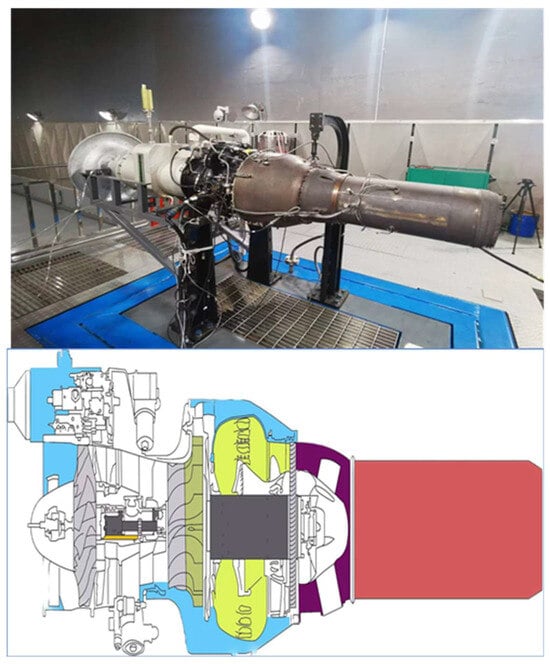 The ZF850 jet engine (Zhongfa Tianxin Aero-Engine Technology Co., Ltd., Nanchang, China) is distinguished by its impressive flight ceiling of 21,000 m and its relatively high-pressure ratio, making it an ideal platform for comparing sustainable aviation fuel with petroleum-derived aviation fuel across various engine speeds. In addition, its relatively low fuel consumption reduces the overall fuel cost during engine tests, rendering it particularly suitable for evaluating the fuel effects on the engine and combustor performances [2,6].