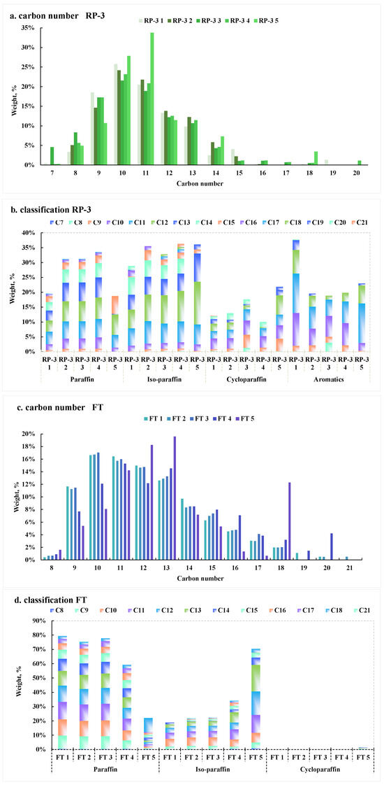 To comply with the requirements of the distillation [27] and freeze points, jet fuels usually contain hydrocarbons within the carbon number range of C8–C16. The carbon numbers and classifications of the two types of fuel were determined and are given in Figure 2. With respect to the classification characteristics, the FT fuels were characterized by only n-paraffin and iso-paraffin without aromatics and cycloparaffin, except for FT5, which contained only 1.6% cycloparaffin. The primary difference among the five samples lay in the ratio of n-paraffin to iso-paraffin. The FT products [47], such as Shell FT, Sasol FT, and Rentech FT, also exhibited similar compositional characteristics. RP-3 fuels typically contain 50–70% n-paraffin and iso-paraffin, 18–38% aromatics, and 10–22% cycloparaffins [48]. For aromatics, all RP-3 fuels have less than 3.5% polycyclic aromatics, with the remainder being alkylbenzene. Polycyclic cycloparaffins are usually below 3%.