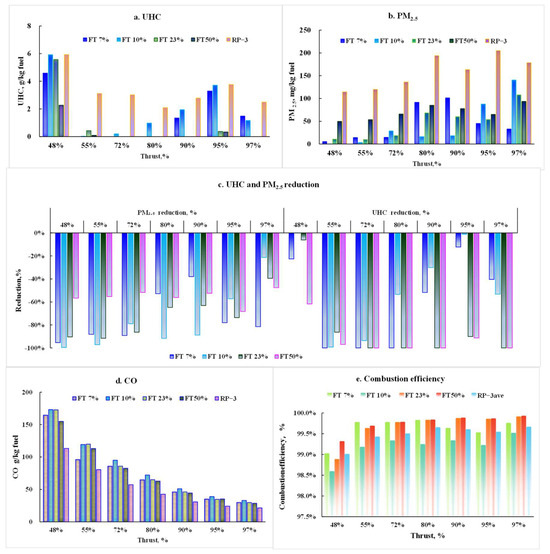 The oxygen concentration in the exhaust provides an inverse indication of the combustion efficiency. Similarly, the CO2 concentration serves as an indicator of the combustion completeness. The measured carbon dioxide concentration gradually increased with the thrust. The CO2 concentration in the exhaust for the blends did not change significantly from that for the RP-3. The equivalence ratios for the FT blends were shifted towards lower FAR values, indicating that a leaner operation condition could improve the completeness of the combustion and result in lower emissions for CO, UHC, and PM2.5. For the emission index at a stable thrust output, carbon atoms in non-CO2 species, including CO, UHC, and PM2.5, appeared in the combustion products, which is attributed to incomplete combustion. According to the total carbon atoms in the emissions, accounting for the energy loss from CO, UHC, and PM2.5, the FT blends can improve the combustion efficiency, as shown in Figure 4e.
