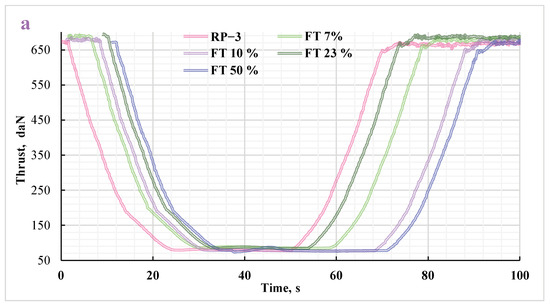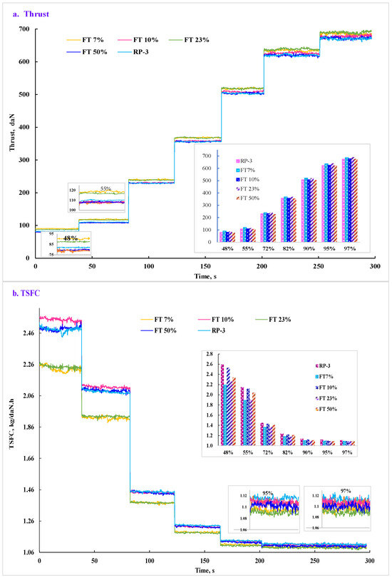 All the FT-blended fuels were compared with RP-3 in terms of the engine performances throughout various operations with continuous recording. Regarding the thrust output, a series of stable thrust output points for the FT blends were investigated in comparison with RP-3 as the baseline at the various operating speed settings, as shown in Figure 6. The transient thrust outputs were assessed to evaluate the characteristics of acceleration and deceleration, as shown in Figure 7.