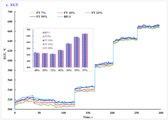 From the perspective of the performance of acceleration and deceleration, as given in Figure 7, the acceleration was investigated by moving the thrust from 48% to 98%, while the deceleration was investigated by moving the thrust from 98% to 48%. It appears the control system compensated by modifying the fuel flow to match the requirements of acceleration and deceleration. As soon as the acceleration or deceleration was completed, the thrust outputs of the blended fuels returned to maintain the same characteristics of the thrust output as before, as shown in Figure 7a. From the perspective of the time scale, the FT-blended fuels had no significant effects on the acceleration and deceleration, considering RP-3 as the baseline, as shown in Figure 7b,c. The same result was previously reported; there was no significant difference in the transient shaft acceleration using a TRS-18 gas turbine engine [24]. The effects of the FT blends on acceleration and deceleration are insignificant, which could be attributed to less difference in the combustion boundaries and similar combustion properties compared to RP-3 in compliance with the drop-in fuel requirement.