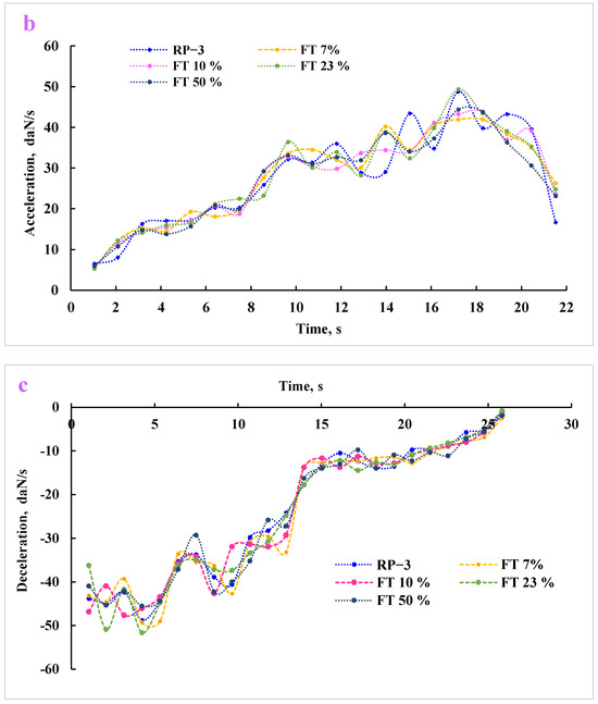 Characteristics of FT blends in acceleration and deceleration. (a). Maximum thrust output, (b). acceleration, (c). deceleration.