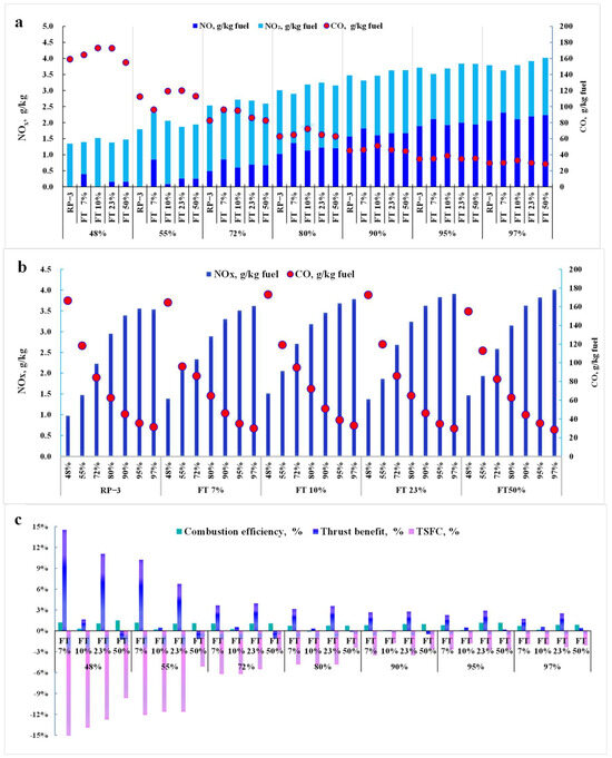 From the perspective of engine performance, as given in Figure 8c, the TSFC, thrust, and combustion efficiency can be categorized as EIFI parameters due to the detectable differences caused by the change in fuel. The FT blends achieved not only an improvement in the thrust and combustion efficiency but also in fuel savings at various thrust outputs.