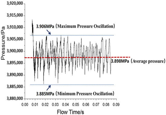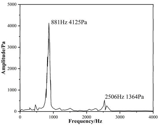 Figure 3 illustrates pressure oscillations from 0.006 s to 0.082 s in the motor. It can be observed that the pressure oscillates between 3.885 MPa and 3.906 MPa, which is consistent with the values observed in the experiment [38]. Figure 4 shows the FFT spectrum based on the pressure data in Figure 3. The frequencies of the pressure oscillation in the first-order and third-order modes are 881 Hz and 2506 Hz, respectively.