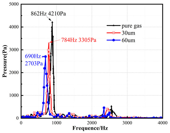 Figure 5 shows the pressure oscillations in the combustion chamber under three different conditions: pure-gas flow; two-phase flow with particles measuring 30 µm; and two-phase flow with particles measuring 60 µm. This indicates that the introduction of a particle phase generally leads to a decrease in both the frequency and amplitude of pressure oscillations. Meanwhile, a larger particle diameter leads to lower amplitude pressure oscillations. Both the amplitude and frequency were significantly reduced for particles measuring 60 µm. Overall, an increase in particle diameter results in a decrease in both the frequency and the amplitude of the pressure oscillations at a constant particle concentration.