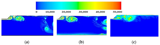 Figure 6 illustrates the internal flow near the backward step under the three different conditions at the time t = 1.57 ms. From Figure 6a, it can be seen that the flow instability in the upstream of the step leads to continuous vortices at the step corner in the pure-gas flow; when introducing 30 µm particles into the flow, the vortex structure and distribution behind the step are essentially identical to those in pure-gas flow (Figure 6b), except that the vortex scale becomes slightly larger. Meanwhile, a small but visible disturbance emerges in the downstream flow field: when the particle size increases to 60 µm, a complete vortex structure at the step corner is no longer observed (Figure 6c). Instead, multiple small-scale vortices form. Additionally, the vortex structure and distribution become disordered, and it becomes difficult to distinguish the boundary of the vortex. In summary, it is evident that an increase in particle diameter leads to a greater disturbance in vortex shedding and more serious instability in the shear layer around the step corner. For a more favorable vortex structure, a particle diameter of 30 µm is chosen for subsequent simulations.
