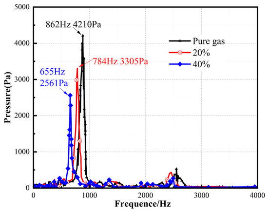 Figure 7 shows pressure oscillations in the combustion chamber under different conditions: pure-gas flow and two-phase flow with particle concentrations of 20% and 40%. From Figure 5 and Figure 7, it can be concluded that compared with the particle diameter, the particle concentration has more significant effects on pressure oscillations. Meanwhile, Figure 7 indicates that introducing particles with a certain concentration decreases both the frequency and amplitude of pressure oscillations. As the particle concentration increases, the primary frequency of pressure oscillations gradually decreases; meanwhile, the amplitude of pressure oscillation significantly decreases.