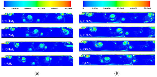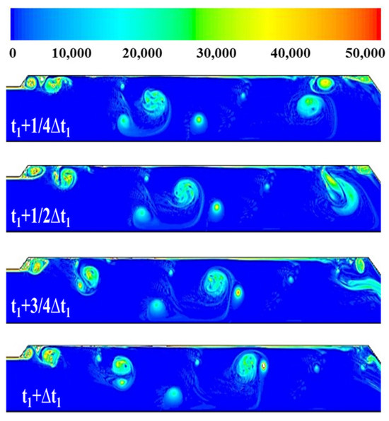 Figure 8 illustrates the vorticity distribution for one period in pure-gas flow. An obvious flow separation occurs near the boundary layer in the upstream of the step due to the large aspect ratio, and a complete vortex structure can be observed at the step corner. From Figure 8, it can be seen that a vortex initially emerges in an unstable shear layer, passing through the corner and flowing counterclockwise towards the downstream. At t1 + 1/2Δt1, the small vortices near the corner gradually grow larger and tend to separate; the vortex subsequently develops and moves toward the nozzle. The presence of a corner in the nozzle-convergent section causes the upstream vortex to split and form a new vortex, and some vortices collide with the nozzle wall and break. The vortex structure and motion are clearly visible in pure-gas flow, allowing for the observation of interactions between the vortex and the wall. The period of vortex shedding is approximately 0.92 ms, and the corresponding frequency is 1081 Hz.