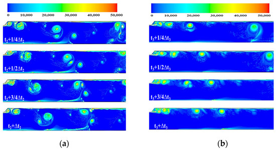 Vorticity distribution with different particle concentrations: (a) 20%; (b) 40%.