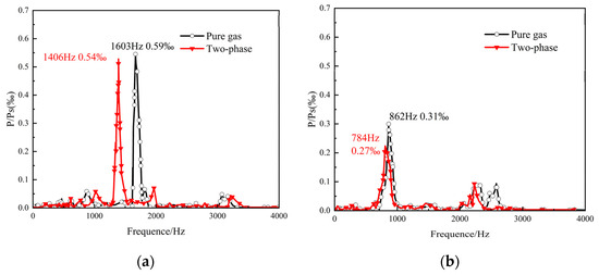 Pressure oscillations under different step locations in two-phase flow: (a) L/D-2.5-4; (b) L/D-5-3.