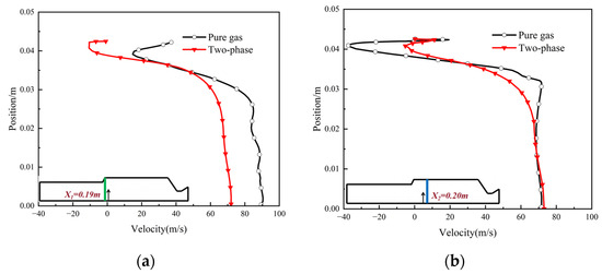 Velocity distribution in cross-sections at different positions: (a) x1 = 0.19 m; (b) x2 = 0.20 m.