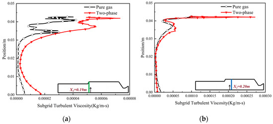 Figure 12 and Figure 13 present the distributions of the axial velocity and turbulent viscosity at locations in the downstream step, with an expansion ratio of 1.4. Compared to pure-gas flow, the velocity decreases and the turbulent viscosity increases in two-phase flow. These differences become smaller when the locations are further from the step in the downstream. Through this comparison, it can be concluded that the introduction of particles hinders the development of vortex motion and increases vortex dissipation. It is difficult for the vortex generated by the step to develop stably in the downstream flow process, which reduces the pressure oscillation frequency.