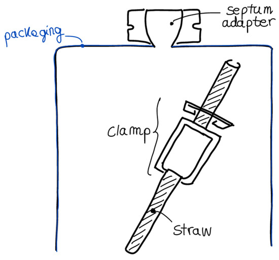 Components of the space beverage packaging: the packaging consists of a multilayer trilaminate structure, while the septum adapter, the straw, and the clamp are made of LDPE.
