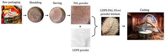 Scheme for the fabrication of LDPE/PAL composite specimens from surrogate packaging: shredding the trilaminate packaging material to reduce it to smaller, manageable pieces; sieving by a 60-mesh sieve to obtain uniformly sized particles of PAL; mixing the PAL particles with the LDPE matrix material to ensure uniform distribution of filler within the LDPE base; shaping the LDPE/PAL composite into test specimens using a casting technique; cooling and solidification, forming the final LDPE/PAL composite specimens.