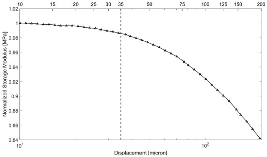 A displacement sweep was performed at a constant temperature of 30 °C, with the displacement amplitude varying from 1 µm to 200 µm at frequency of 1 Hz. This test was conducted to determine the appropriate displacement amplitude to apply during the test, ensuring that the material deformed within its linear viscoelastic region. Figure 7 shows the normalized storage modulus as a function of the displacement amplitude, obtained from the displacement sweep test on a pristine LDPE sample. The linear viscoelastic behavior was observed to lie approximately between 1 µm and 75 µm. Therefore, the displacement amplitude for testing LDPE samples was set to 35 µm.