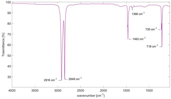 The qualitative analysis involved the determination of characteristic peaks associated with the molecular vibrations. The inner side spectrum (Figure 8) shows two C–H asymmetric and symmetric stretching vibrations identified by two narrow peaks at 2916 cm−1 and 2848 cm−1, respectively [45]. Bending [46] and wagging [47] vibrations of CH2 were observed in the bands of 1462 cm−1 and 1368 cm−1 respectively. Two C–H rocking modes peaks appeared in the fingerprint region at 730 cm−1 and 718 cm−1 [45], revealing a spectrum that can be identified as characteristic of LDPE (Table 1). Regarding the potential presence of LLDPE in the LDPE side, the spectrum closely resembles that of either LLDPE or LDPE. This similarity arises because the peaks that characterize these two types of polyethylene are very analogous in shape and marked by identical peaks [48,49]. The confirmation of LLDPE presence on the LDPE side was further confirmed by DSC analysis of the trilaminate PAL, as detailed in Section 3.3.