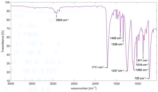 Figure 9 shows several distinct peaks: C=O stretching at 1711 cm−1, (C=O)–C stretching of ester at 1237 cm−1, and O–CH2 stretching at 1092 cm−1. This evidence, along with a small CH2 stretching peak at 2923 cm−1, a narrow peak in the fingerprint region at 720 cm−1 [46], and additional peaks in the region between 1700 cm−1 and 700 cm−1 (Table 2), reasonably confirms that the outer layer material of the surrogate packaging was PET. Therefore, it can be concluded that the coffee packages adequately simulated astronaut beverage packaging, as the materials were the same as those reported in [30,31]. For the sake of graphical clarity, not all peaks listed in Table 2 are depicted in Figure 9.