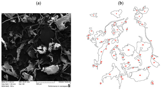 The particle size and distribution of the trilaminate PAL filler were unknown a priori. Due to the filler’s larger size and irregular shapes, a comprehensive analysis was necessary to assess its potential impact on the composite’s properties. SEM images were processed, filtered, and converted into binary images to identify individual particles (Figure 10).