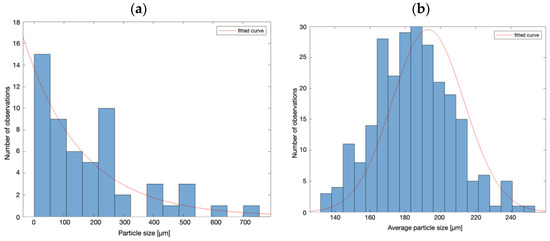 As previously highlighted in Section 2.3, the bootstrap resampling technique was employed to estimate the average particle size of a non-normally distributed dataset. The average particle size was calculated for each resampled dataset, determining the distribution of the average particle sizes. Initial analysis of the raw data yielded an average particle size of 189.1 ± 171.5 µm, with a relatively high standard error (Figure 11a). However, after applying the bootstrap resampling technique, the standard error decreased consistently, leading to a more refined estimate of the average particle size: 186.9 ± 22.9 µm (Figure 11b).