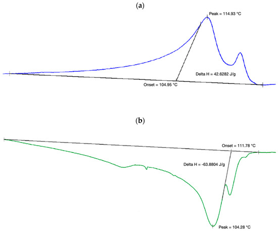 The onset, starting, ending, and peak temperatures for the melting and crystallization transitions of the LDPE, obtained from the heating and cooling cycle curves, respectively, and averaged across the five different samples, are reported in Table 3 and Table 4. These tables also present the specific enthalpy values, which refer to the total area of each curve, including the contributions from the LLDPE peak.