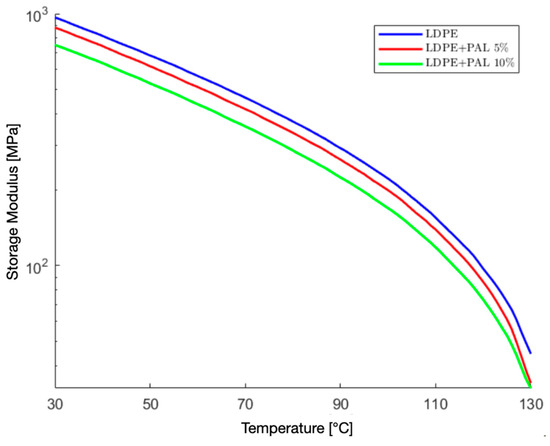 Storage modulus as a function of temperature for pristine LDPE, LDPE-PAL 5wt%, and LDPE-PAL 10wt%.