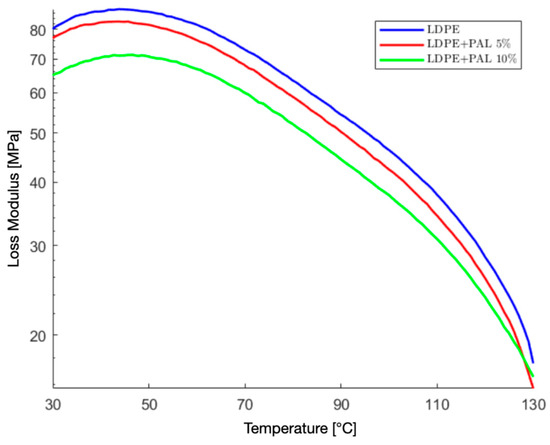 Loss modulus as a function of temperature for pristine LDPE, LDPE-PAL 5 wt%, and LDPE-PAL 10 wt%.