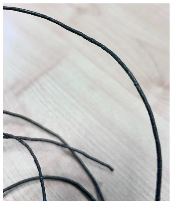 Figure 15 shows the filament fabricated by the extrusion of the 10 wt% LDPE/PAL composite materials. By measuring the diameter of the filament at the same cross-section but from different diametrically opposed points, the roundness of the section was verified. Repeating this operation on multiple sections along the longitudinal direction of the filament allowed for an assessment of the consistency of this roundness. The average diameter was found to be 1.74 ± 0.03 mm. The roundness and consistency of the cross-section were crucial to ensure that the 3D printing aligned with nominal parameters. Additionally, a visual inspection of the lateral surface of the filament showed no visible porosity, which is essential to prevent disruptions in material flow during printing and to maintain high printing quality [36].