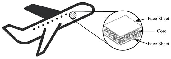 The aircraft skin is a critical component of an aircraft, with its structure illustrated in Figure 1. During flight operations, it is subjected to various complex loads and environmental influences, rendering it susceptible to defects such as dents, cracks, corrosion, and others []. Among these defects, water ingress in aircraft honeycomb structures is particularly hazardous, as it can lead to a deterioration in structural performance and potentially catastrophic accidents []. Swiftly identifying areas of water accumulation within the honeycomb panels and accurately assessing their impact on structural strength and aerodynamic performance can help promptly identify and eliminate potential risks. This, in turn, extends the aircraft’s lifespan and reduces maintenance costs.