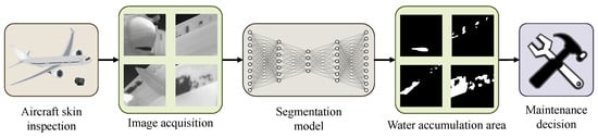 Schematic of aircraft skin water accumulation detection via deep learning.