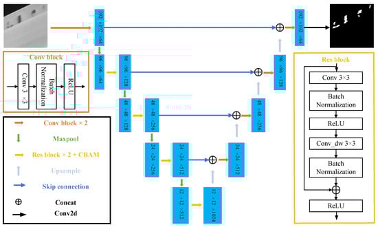 The model takes the infrared image of the aircraft skin and transforms it into a 3D matrix as input. The contraction path initiates with two convolutions that extract features from the input image. Subsequently, a batch normalization layer is embedded after the convolution layer to prevent overfitting, followed by a rectified linear unit (ReLU) [] as the activation function. The feature maps are then inputted into the residual convolution block of the first submodule. In the initial stage, a max pooling downsampling operation halves the feature size and doubles the number of channels, thereby reducing the influence of rotation and translation while also averting overfitting. Following this, two residual blocks with depthwise separable convolution double the number of channels, leaving the feature map size unchanged. A channel attention mechanism and a spatial attention mechanism are subsequently applied, allowing the extraction of finer and more effective features. This process repeats as the obtained feature maps are fed into the next submodule.