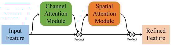 Attention mechanisms have been widely used in various fields, such as computer vision, natural language processing, and others [,]. Convolutional neural networks (CNNs) tend to disregard essential information while completing tasks, such as image classification and target detection, due to various feature scales and channel numbers. To address this issue, Woo et al. [] introduced CBAM, designed to help CNNs focus on relevant yet meaningful features in two dimensions: channel and space.