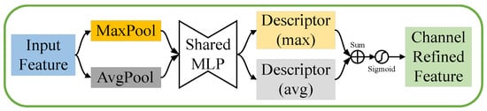 The channel attention module refines feature maps by assessing the significance of individual channels. Figure 5 demonstrates how spatial information is garnered from the feature map via maximum and average pooling, creating two scalars ( and ) that suggest the importance of each channel. These descriptors then enter a multilayer perceptron (MLP) with a hidden layer that determines the relevance of each channel, enhancing useful features while suppressing unimportant ones. Lastly, the two descriptors combine element-wise and are normalized using a sigmoid function to produce a channel attention mapping .