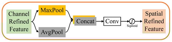 In contrast, the spatial attention module determines feature map pixel importance by resizing the maps. Figure 6 shows how the channel information undergoes maximum and average pooling to create two 2D mappings: and , respectively. These two feature mappings are then stitched together along the channel direction and fed into a standard convolutional layer for convolutional operation. Lastly, the spatial attention mapping is normalized by the sigmoid function. The specific formula is as follows: