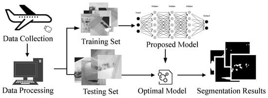 This paper employs a deep learning approach to segment infrared images of the aircraft skin surface, identifying areas of water accumulation. Figure 8 presents a step-by-step demonstration of our research. We present a detailed description of the experimental process.