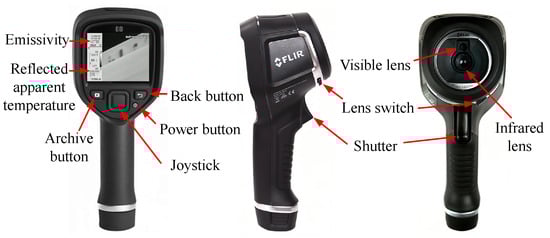 In order to obtain infrared images of the aircraft skin, detection is conducted on an aircraft that has just landed. Multiple sections of the aircraft, including the wings, fuselage, and other areas prone to moisture accumulation, are imaged to ensure the model’s applicability across various structural regions. It is worth mentioning that the FLIR E8 infrared thermal camera, manufactured in the United States and shown in Figure 9, is used in the study, and its parameters are given as follows: The infrared resolution is , the thermal sensitivity is 0.06 degrees Celsius, and the field of view is 33 degrees. The camera provides an accuracy of ±2 °C or ±2% of the reading, with an operating ambient temperature range of 10 °C to 35 °C and a minimum measurable object temperature of 0 °C. For accuracy in temperature measurements, the emissivity was set to 1, and the reflected apparent temperature (RAT) was set to 22.78 °C.