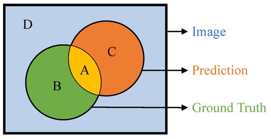 Figure 11 illustrates the assessment of the model’s prediction. Here, region A consists of the portion of the predicted target that intersects with the true target, while region B represents the portion of the target that the model failed to predict. Region C corresponds to the portion of the target that the model incorrectly predicted, and region D contains the background that was accurately predicted.