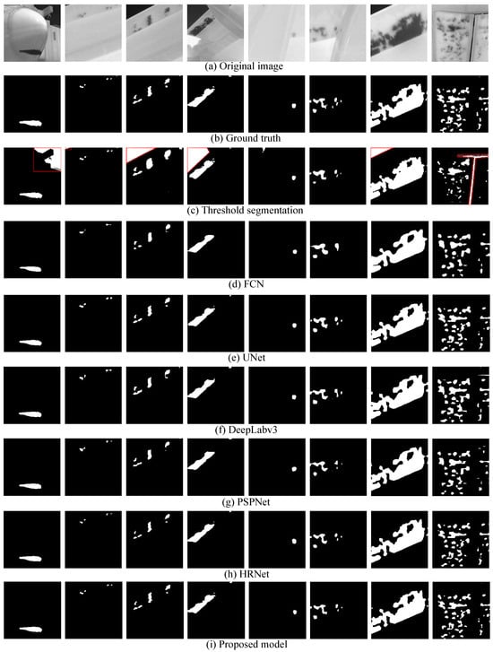 This paper demonstrates the robustness and superiority of the proposed model by comparing it with several state-of-the-art models, including FCN, U-Net, DeepLabv3, PSPNet, and HRNet. Figure 12 displays typical aircraft skin infrared images and their corresponding segmentation results.