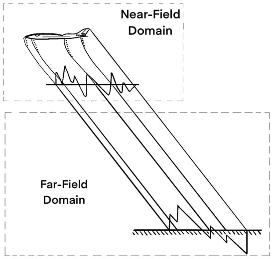 The first method is a high-fidelity approach that involves two stages to model the sonic boom phenomenon as shown in Figure 1. In the first stage, Computational Fluid Dynamics (CFD) simulations are performed to analyze the near-field shock wave behavior, capturing the generation of the shock wave caused by the supersonic velocity of an aircraft []. The second stage involves far-field propagation, where ray tracing is employed to simulate the propagation of the shock wave through a non-uniform atmosphere. This process is governed by the Augmented Burgers Equation, a non-linear propagation model that incorporates steepening effects for sound waves, as described by Cleveland [] and applied by Rallabhandi [] to sonic boom prediction.