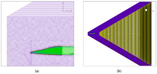 The computational mesh was composed of two different regions: an unstructured grid in the proximity of the aircraft designed as a half cylinder, and a structured grid aligned with the Mach angle for the remainder part of the domain as visible in Figure 2. Figure 2a highlights the difference between the unstructured and structured domain, while Figure 2b shows the whole computational domain. The numerical elements are hexahedral in the structured domain, tetrahedral in the unstructured zone, and pyramidal to connect the two zones. The total number of elements for the configuration is slightly above 20 million.