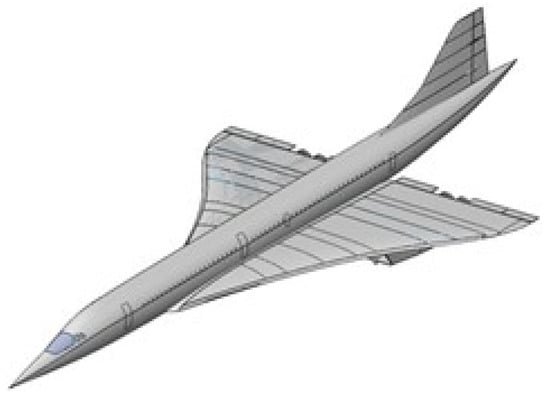 The supersonic aircraft represents a modernized version of the Concorde, which was re-designed with a cruise speed of Mach 2 [] at an altitude of around and is referred to as “CS1”. A detailed description and analysis of the near-field simulations for the reference aircraft can be found in []. To scale the vehicle, ASTRID-H was used, which is an in-house design tool of Politecnico di Torino [], for defining the configuration of an aircraft. The main goal of the re-design was the use of biofuel as a propellant while maintaining the cruise speed of Mach 2. The design process started from a set of design constraints and operational requirements very similar to the reference Concorde aircraft. The final characteristics of CS1 are shown in Table 1.