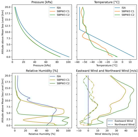 The International Standard Atmosphere does not define winds, while especially vertical winds can have a major impact on the spreading of the sonic boom shock wave front. For this reason, two atmospheric profiles from measured weather data have been chosen for the study. Choosing a representative atmosphere is a statistical exercise, which has been conducted before. The choice fell on the atmospheric profiles provided for the participants of the Third Sonic Boom Prediction Workshop (SBPW3). To assess sonic boom far-field propagation methods, the organizers selected two atmospheric profiles with specific characteristics from an array of real measured atmosphere profiles over the US []. The selected profile used for the first case study of the workshop will be referred to as “SBPW3 Case 1” and reflects on an atmospheric state that leads to a wide range of azimuth angles reaching the ground for an eastward flying aircraft. The second selected profile will be referred to as “SBPW3 Case 2” and refers to an atmospheric state that leads to a particular wide sonic boom carpet for an eastward flying aircraft. For both atmospheres, altitude-dependent temperature, pressure, relative humidity, and horizontal wind speeds are given in tabular format [,]. For this study, the values are interpolated with cubic splines, to prevent gradient discontinuities in the simulation domain. The atmospheric profiles are visible in Figure 6. The ground at standard conditions is set to be at an altitude of 0.1 m, and due to the definitions of the realistic profiles, at an altitude of 264.1 m for the SBPW3 cases.
