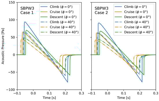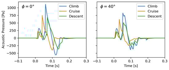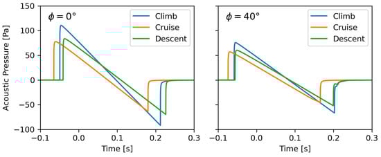 The lowest peak amplitudes (e.g., 79.7 Pa at an azimuth angle of 0°) are obtained during cruising, which has the highest altitude (18,500 m) and the highest Mach number of the three conditions. In comparison to the predictions for the descent case, the cruise N-wave signals have a slightly shorter duration. With an on-track signal length of 201.8 ms, they are still longer than those predicted for the lower and slower climb conditions. Regardless of the operating condition, increasing the off-track angle always leads to decreasing amplitudes and increasing signal duration.