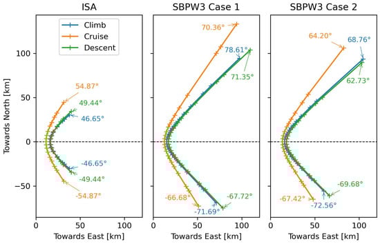 The azimuth angle also defines a ray’s initial position and orientation on the Mach cone surface. The ray starts on the trajectory point, which is set above the origin of the ground surface plane, with the height being defined by the aircraft’s altitude. The orientation of a starting ray is always perpendicular to the Mach cone surface around the aircraft’s velocity vector. In this study, the aircraft is always heading towards the east, with a flight path inclination defined by the operating condition. The parameter of variation for the ray tracing is the azimuth angle . Its orientation is clockwise around the plane’s centerline from the pilot’s view, with 0° being at the bottom of the aircraft. Thus, the positive azimuth angles are defined towards the aircraft’s port side (i.e., left-hand side of the pilot’s perspective), and the negative azimuth angles are located at starboard (i.e., right-hand side of the pilot’s perspective) as is visualized in Figure 3.