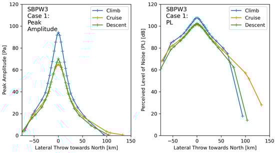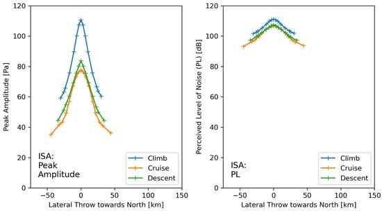 As there is still ongoing research on the definition of suitable sonic boom metrics [,], the study provides the ground impact of the simulated sonic booms with not only one but a few relevant acoustic metrics, which have shown to correlate with sonic boom annoyance [] and might be considered for a yet-to-be-defined standard on sonic boom perception. A widely used loudness metric for the sonic boom is Stevens’ Perceived Level of Noise Mk VII (PL) [] which is given in decibels (dB). The PL values in this paper are computed with the open-source Python library PyLdB []. Sound Exposure Levels (SEL) with frequency weightings (A, B, C, D) have been shown to correlate with sonic boom annoyance. They are computed according to ISO 1996-1:2016 and are given in dB []. Indoor Sonic Boom Annoyance Predictor (ISBAP) is a metric that was derived to correlate with sonic boom annoyance inside buildings. It is a weighted combination of PL, SEL(A) and SEL(C) and is given in dB [].
