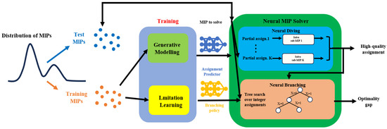 Recently, the joint research team of DeepMind and Google published their work on designing a heuristic algorithm to solve large-scale mixed-integer programming (MIP) problems using shared structures from large datasets. Their heuristic algorithm generates high-quality joint variable assignments, targeting the two core sub-problems of MIP [28]. This method reduces the gap between variable values and optimal values. Neural diving and neural branching, based on neural networks, are integrated with MIP solvers such as SCIP [29]. Specifically, neural diving trains a deep neural network to generate values for integer variables, while SCIP is used to handle the remaining variables for smaller MIPs, leading to high-quality joint variable assignments [30]. Neural branching, on the other hand, trains a deep neural network to select branching strategies in the branch-and-bound process. This approach, combined with techniques like Full Strong Branching, reduces the gap between the target and optimal values by constructing smaller decision trees and generating new variables.