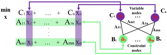 Bipartite graph representation for neural network-based MIP solving. This image illustrates a bipartite graph representation of a mixed-integer programming (MIP) problem used as input for a neural network.